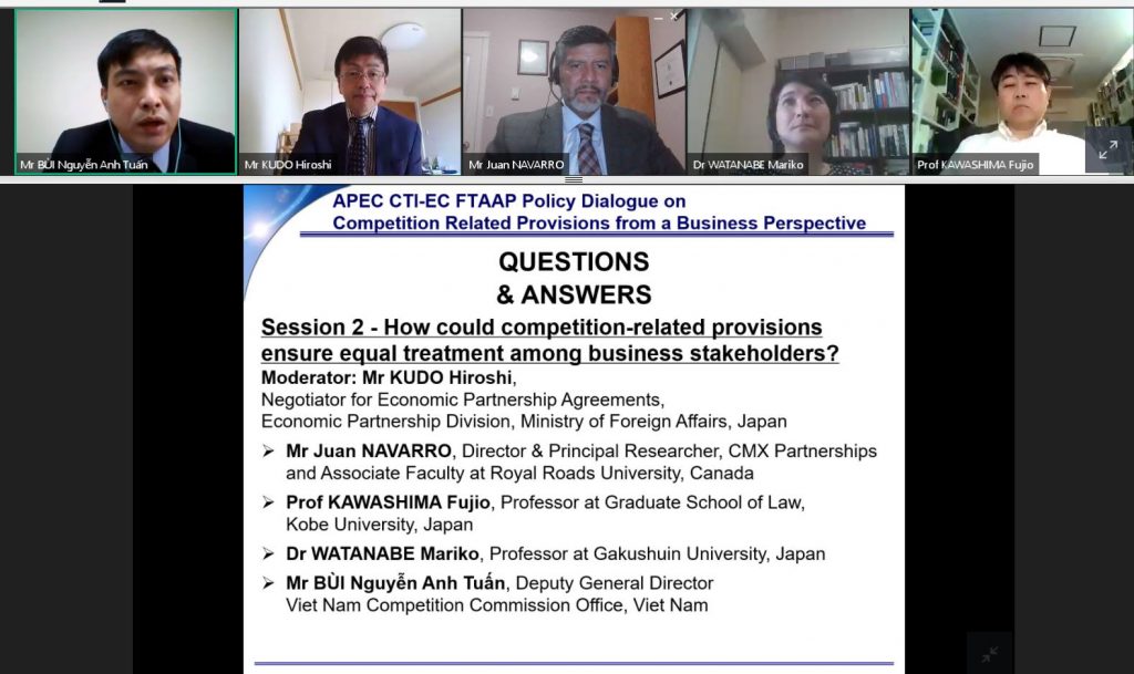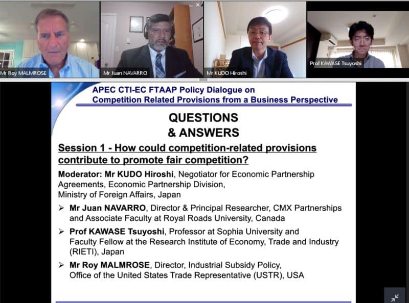 Japan, Sep 2020. CMX Partnerships Director, Mr. Juan Navarro, was the keynote speaker for the APEC Policy Dialogue on Competition Policy event held virtually on September 16-17. The objective of this international event was to examine the value of including high-quality and comprehensive competition related rules in Free Trade Agreements that ensure a competitive business climate by providing a predictable and supportive environment for business and investment. During his keynote Navarro presented some of the main challenges and obstacles that competition policy faces in the context of trade accords but also some of the remedies to overcome these and move forward in the solutions.